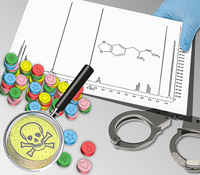 Ecstasy is a term typically used to describe drugs of abuse containing 3,4-methylenedioxymethamphetamine (MDMA). Recently, the trafficking of ecstasy tablets has grown and considerable higher amounts have been seized in Brazil. Herein, we present the development and validation of a 1H-qNMR (quantitative nuclear magnetic resonance of hydrogen) analytical forensic method capable both to identify and quantify MDMA in ecstasy tablets. Details are presented in the Article A Validated NMR Approach for MDMA Quantification in Ecstasy Tablets by Nathalia S. Almeida, Luiz E. C. Benedito, Adriano O. Maldaner and Aline L. de Oliveira on page 1944.