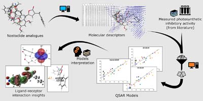2D and 3D molecular descriptors were calculated, selected and used to build quantitative structure-activity relationship (QSAR) models to predict the herbicide activity of a set of nostoclide analogues (experimental data retrieved from the literature). The models were interpreted to understand the ligand-receptor interactions.