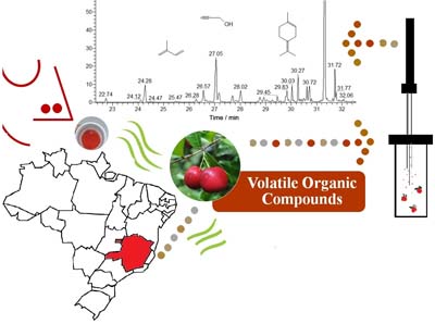 Extraction of volatile organic compounds from acerola fruits through the use of different solid phase microextraction (SPME) fibers.