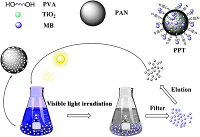 Polyacrylonitrile (PAN)/polyvinyl alcohol (PVA)/TiO2 (PPT) beads structure and removal of methylene blue (MB) under visible light irradiation.
