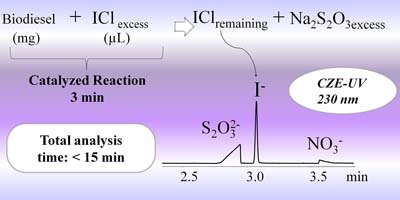 Strategy for fast determination of iodine number of biodiesel samples by capillary zone electrophoresis (CZE). Low sample amount (mg), reactant (µL), and organic solvent (µL) are required.