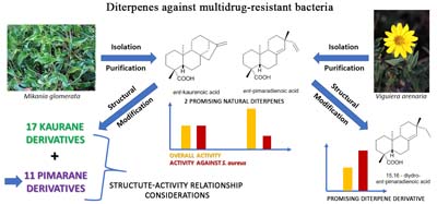 Two natural diterpenes were evaluated against multi-drug resistant (MDR) Gram-positive bacteria and were converted into 28 semi-synthetic derivatives. Both natural compounds displayed interesting activity overall, but not so good against Staphylococcus aureus, a relevant multi-resistant pathogen. The activities of all derivatives were determined what revealed one with good overall activity and with a noteworthy activity against S. aureus. All other results could further clarify some structure-antimicrobial activity relationship questions about diterpenes.