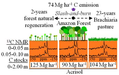 Soil carbon stocks and organic matter composition (assessed by 13C NMR spectroscopy) in an Acrisol under native Amazon Forest and natural regeneration or pasture cultivation after native Amazon Forest slash-and-burn, which emitted 74 Mg ha-1 of carbon to the atmosphere.