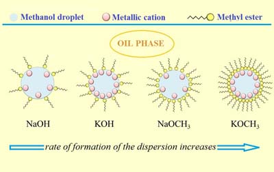Methyl esters and alkaline catalysts are adsorbed on the surface of the methanol oil, favoring the dispersion of the methanol in the oil phase. The adsorption of potassium is greater than that of sodium.