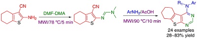 A series of thieno[2,3-d]pyrimidin-4-amine derivatives were synthesized by using a microwave-enhanced conditions. Amongst these compounds, three exhibited moderate cytotoxic activities against A549, CT26 and HepG2 cell lines.