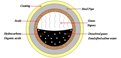 Illustration of the cross section of an oil pipeline showing the scale formed by sweet corrosion.