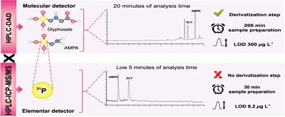 The image represents the parameters in which high performance liquid chromatography using inductively coupled plasma with triple quadrupole mass spectrometer (HPLC-ICP-MS/MS) was superior to high performance liquid chromatography with diode array detector (HPLC-DAD) in determining glyphosate and aminomethylphosphonic acid (AMPA).