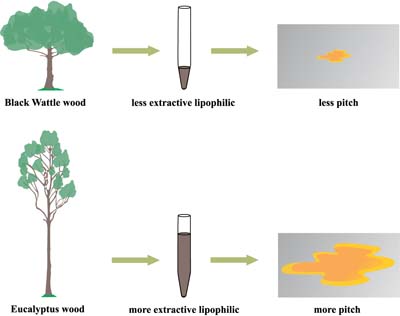 The constituents that can generate the pitch are in smaller quantities in the extracts of Acacia mearnsii wood in relation to the eucalyptus wood.