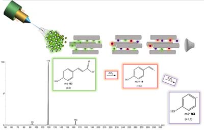 Five phenolic acids were evaluated according to the fragmentation profile by collision-induced dissociation (CID) using triple quadrupole mass spectrometry by electrospray ionization in negative ionic mode (ESI(−)-MS/MS), combined with thermochemical data obtained by computational chemistry and hydrogen by deuterium (H/D) exchange.