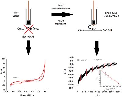 Cysteine (Cys) does not present voltammetric response at bare graphite-polyurethane composite electrode (GPUE) or even at non-treated GPUE containing electrodeposited copper nanoparticles (CuNP). When GPUE-CuNP is electrochemically pretreated in basic medium the Cys response can be observed based on its interaction with Cu oxides at electrode surface allowing analytical applications in an amperometric wall-jet procedure.