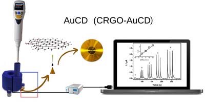 Chemically reduced graphene oxide on Au gold electrodes obtained from recordable CDs as a novel, low-cost and sensitive sensing platform.