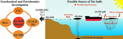 Geochemical investigation of tar balls collected in two distinct years (2012 and 2014) in a Brazilian beach using several analytical techniques suggesting that the area is subjected to frequent spill from the same source.