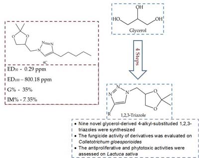 Nine 1,2,3-triazole derivatives were synthesized and had their fungicidal, phytotoxic and antiproliferative activities evaluated.