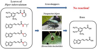 The amides from leaves of Piper tuberculatum are hydrolyzed by the weevil N. bipes and by caterpillars of H. hectorides but not bygeneralist grasshoppers.