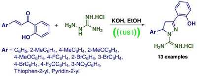 Thirteen new amidino pyrazolines were synthesized under ultrasound in 15-83% yield. Some examples showed promising antibacterial activity.