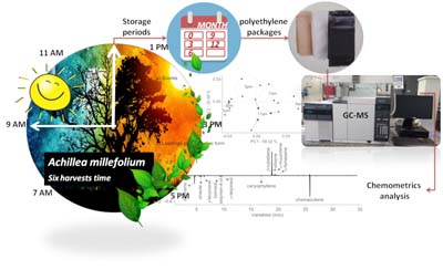 The metabolic profile of Achillea millefolium essential oil by chemometric analysis on gas chromatography-mass spectrometry (GC-MS) data in six different collection times and five storage periods, employing three different polyethylene packages, viz. white, silver and black.