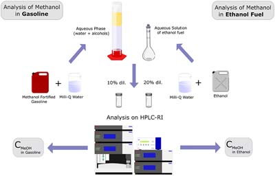 Simple and fast methodology for detection and quantification of adulterant methanol in gasoline and ethanol fuel.