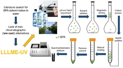 The picture shows a flowchart of the method: beginning with the broad literature search made for bisphenol A (BPA) determination in water samples, followed by the extraction and back-extraction steps performed in this study.
