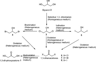 The pharmochemicals 1,3-dihydroxyacetone (1), 1,3-dichloroacetone (6), 1,3-dibromoacetone (7) and 1,3-diiodoacetone (8) were efficiently synthesized from glycerol in good yields using reagents supported on polymer resins or alumina, some of them under solvent free conditions.