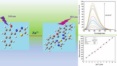 A new designed fluorescent chemosensor TYMN ((E)-1-((thiazol-2-ylimino)methyl)naphthalen-2-ol) for highly sensitive and selective tracing of trace amount of Zn2+ ions in some real samples. The probe TYMN may have application as a fluorophore to detect the Zn2+ in living cells.