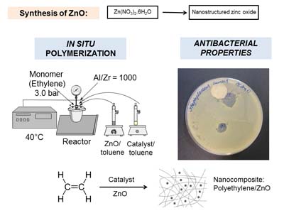 Antimicrobial nanocomposites with 1, 3, and 5 wt.% of nanostructured ZnO in polyethylene were obtained using in situ polymerization.