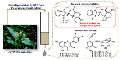 Three anti-dengue active monoterpene indole alkaloids were isolated in just one-step directly from the leaf MeOH extract of Psychotria leiocarpa.