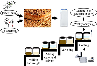 It was studied the dissipation of insecticides residues in rice and the translocation of these insecticide residues in husked rice for 35 days. For that, the solid-liquid extraction methods with low temperature partition (SLE/LTP) method followed by gas chromatography with electron capture detection (GC-ECD) for unhulled and husked rice were optimized and validated.