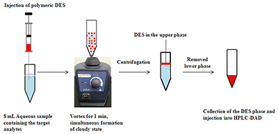 A polymeric deep eutectic solvent composed of DL-menthol and polyethylene glycol 400 was prepared and used as extraction solvent in vortex-assisted liquid-liquid microextraction method combined with high performance liquid chromatography-diode array detector for the determination of parabens.