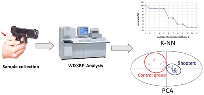 Gunshot residue (GSR) was analyzed with wavelength dispersion X-ray fluorescence spectrometry (WDXRF), discriminated according firearm/cartridge type by principal component analysis and classified as GSR and non-GSR by k-nearest neighbors (k-NN) method.
