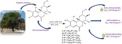Bergenin of Peltophorum dubium roots and its alkyl alcohol derivatives displayed moderate and good inhibitory effects on