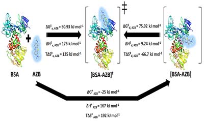 Bovine serum albumin (BSA) interacts with azure B (AZB) or azure A (AZA) through a transition complex. The formation of activated and thermodynamically stable complexes was entropy-driven at 25 °C.