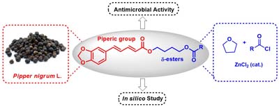 Fifteen new piperine derivatives were planned and synthesized. The new compounds were obtained through the substitution reaction between δ-chloro-esters and potassium piperate, and were evaluated through in silico study and in vitro for antimicrobial activity.