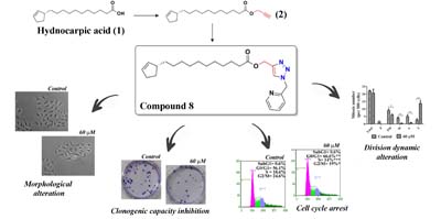 Conversion of hydnocarpic acid into a triazole compound 8 with antiproliferative activity (concentration able to inhibit 50% growth (IC50) = 63.96 ± 3.98 µM) against lung adenocarcinoma (A549).