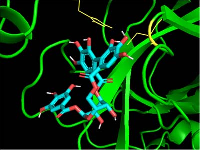 Corilagin docked into the binding site of coronavirus 2 (CoV-2) main protease.