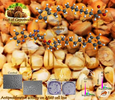 The hydnocarpic acid isolated from Carpotroche brasiliensis seed oil was used to obtain a series of derivatives containing1,2,3-triazole ring. The derivative (R)-(1-(pyridin-2-ylmethyl)-1H-1,2,3-triazol-4-yl)methyl-11-(cyclopent-2-en-1-yl) undecanoate exhibited promising antiproliferative activity on the lung adenocarcinoma cell line by inhibiting cell cycle progression at G1 phase. Details are presented in the Article Synthesis of 1,2,3-Triazole Derivatives of Hydnocarpic Acid Isolated from Carpotroche brasiliensis Seed Oil and Evaluation of Antiproliferative Activity by Liseth S. Osorio, Marisa Ionta, Antonio J. Demuner, Bianca L. de Sousa, Guilherme O. Ferraz, Eduardo V. V. Varejão, Guilherme A. F. Silva, Eduardo J. Pilau, Evandro Silva and Marcelo H. dos Santos on page 2500.