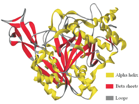 Model of UDP-N-acetylglucosamine pyrophosphorylase from M. perniciosa constructed by comparative modeling show 13 alpha helix (region in yellow) and 24 beta sheets (region in red).