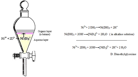 Flotation of the Ni and dimethylglyoxime (D) complex at the aqueous solution and n-hexane interface. [NiD2]2- could form in alkaline medium and has very low solubility in water and organic phase.