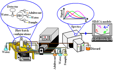 Automatic flow-batch analyzer for adulteration detection in distilled spirits. Components: electronic actuator, flow-batch chamber, magnetic stirrer, peristaltic pump, solenoid valves, microcomputer and UV-Vis spectrophotometer.