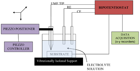 SECM is a scanning probe microscopy (SPM) and operated by scanning or "rastering" an ultra-microelectrode (UME) over a surface to be investigated. UME is referred as "tip" and can be operated under amperometric or potentiometric conditions.