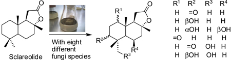 Incubation of sclareolide with eight different fungi species in two different media, afforded six different compounds, four of which were found to be new substances. Cytotoxic evaluation of the compounds indicated that two compounds displayed activity against several cancer cell lines.