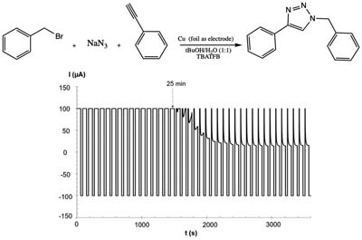 Electrochemical assistance in the click reaction provides a remarkable fast effect.