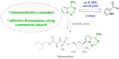 Three chemical steps route, including a highly chemoselective cyanation of pyrrol-2-carboxaldehyde, for the preparation of remdesivir's nucleobase is presented.