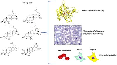 Six triterpenes were evaluated for their in vitro activity and their in silico binding affinity to PfENR (Plasmodium falciparum 2-trans-enoyl-reductase). They were also investigated with respect to their hemolytic and cytotoxic activities.