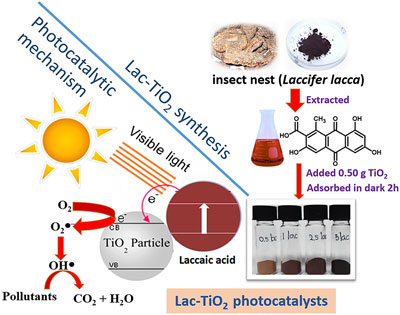 Laccaic acid-modified TiO2 for enhancement of visible light-responsive photocatalytic efficiency.