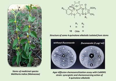 Waltheria indica is a plant species that has a pantropical distribution and biosynthesizes 4-quinolone alkaloids. These substances were submitted to biological tests, including chemosensitization assays that use mutant strains of Saccharomyces cerevisiae, which overexpress proteins of Candida albicans (that confer resistance to xenobiotics). Some of these alkaloids showed antimicrobial activity against these resistant strains and also showed a synergistic effect when administered together with the triazole antifungal fluconazole. Details are presented in the Article Leishmanicidal and Antimicrobial Activities of 4-Quinolone Alkaloids from Stems of the Medicinal Plant Waltheria indica (Malvaceae) and their Chemotaxonomic Significance by Raquel M. Silva, Levy T. S. Domingos, Gabriellen M. M. de Castro, Marinella S. Laport, Antônio Ferreira-Pereira, Murilo M. C. Lima and Fernando Cotinguiba on page 1291.