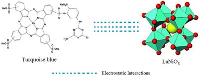 The removal of environmental contaminants such as Turquoise Blue dye from an aqueous medium can be made using LaNiO3 material, with perovskite structure, and occurs due to electrostatic interactions between both.