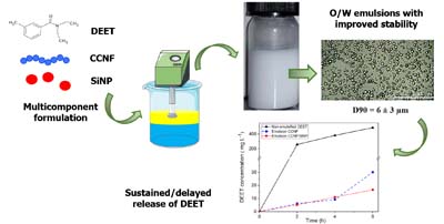 Stabilization of oil-in-water emulsions containing N,N-diethyl-3-methylbenzamide (DEET) using oppositely charged cationic cellulose nanofibrils (CCNF) and silica nanoparticles (SiNP) to allow extended and sustained release of DEET.