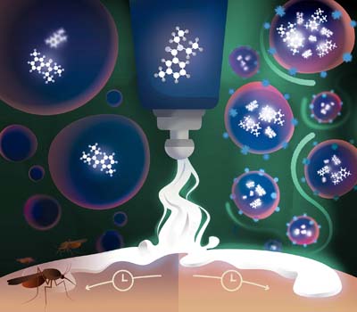 The efficient encapsulation of N,N-diethyl-3-methylbenzamide (DEET), an insect-repellent compound, in mineral oil-in-water emulsions was achieved using a tailored combination of surfactants, cationic cellulose, and silica nanoparticles. The combined action of these non-toxic materials as emulsion stabilizers allowed a sustained release of DEET for at least six hours, showing the potential of these formulations for an extended repellent effect. Details are presented in the Article Efficient Encapsulation and Controlled Release of N,N-Diethyl-3-methylbenzamide (DEET) from Oil-in-Water Emulsions Stabilized by Cationic Nanocellulose and Silica Nanoparticles by Luis M. Gutierrez-Beleño, Vincenzo Calabrese, Janet L. Scott, Karen J. Edler and Aurora Pérez-Gramatges on page 13.
