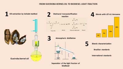 Gueiroba kernel oil was obtained by Sohxlet extraction. Transesterification was realized with methanol. Atmospheric distillation was made to separate the lighter phase. The blends were analyzed.
