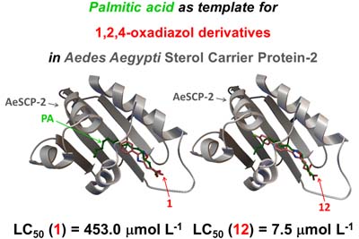 Palmitic acid (in green) working as template for the docked structures 1 and 12 at Aedes aegypti Sterol Carrier Protein-2. The larvicidal activities for these structures are 453.0 and 7.5 mmol L-1, respectively. These results point out the role of the hydrophobicity for the larvicidal activity of these 3-(3-aryl-1,2,4-oxadiazol-5-yl)propionic acids (AOPAs).